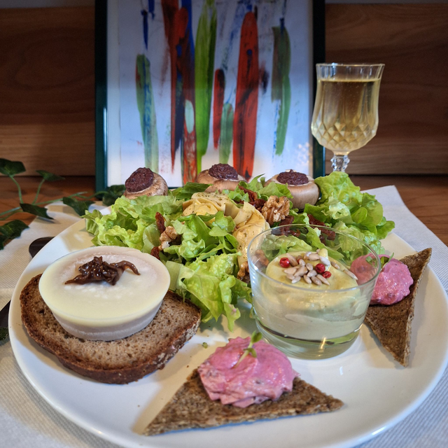 Composition :Médaillon de Fogra sur pain moelleux, confit d’oignon, champignons garnis de Figolive, crakers de Tamara, verrine de Duchesse, batavia, coeurs d’artichauts, tomates séchées, noix, vinaigrette* et graines germées.